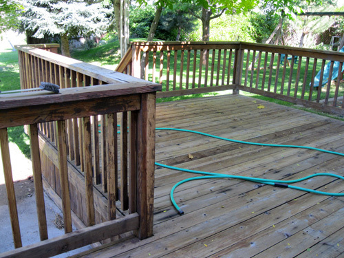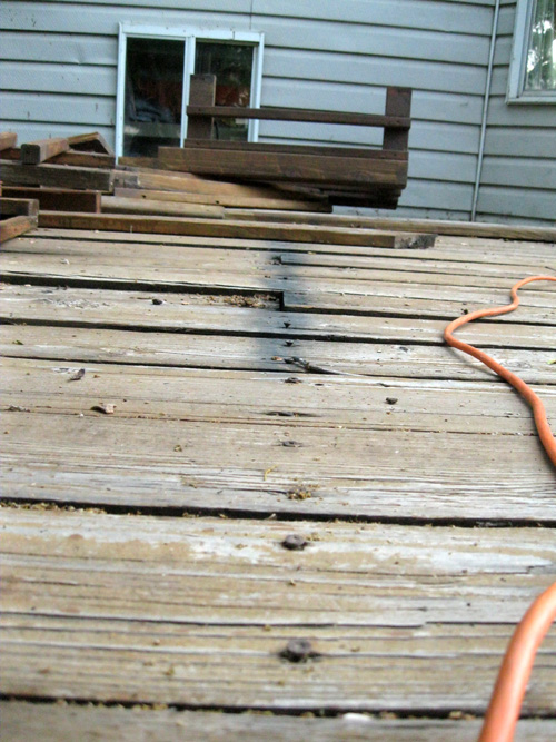 I took these pictures of it three years ago when we made a family project out of pressure washing and re-staining it. Look at how lovely it was. Particularly note the even-ness of the deck planks.