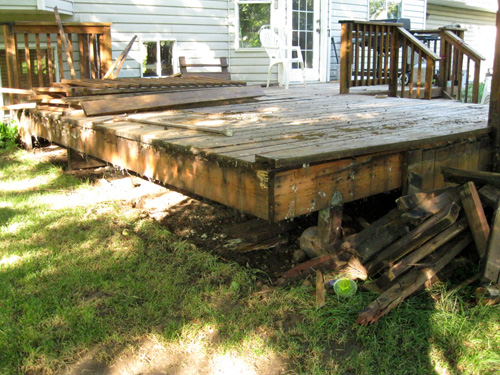 I took the picture after we’d already spray painted a warning line on a particularly bad spot and after I’d removed some railing. Most of the deck was still solid underfoot, but some of it felt…soft. We figured we had a rotten beam. Howard and I discussed options. We don’t have the money to replace the deck. To get at the bad spot, we’d have to pull apart everything. We knew once it was apart, we probably couldn’t get it back together. We decided that demolition was what we had to do, because it was going to be a safety hazard otherwise.