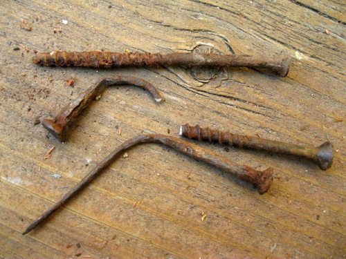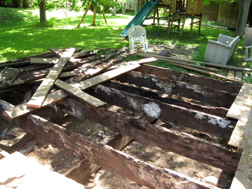 We used a crowbar and a 4′ wrecking bar to get the planks up. Except usually we only had to get one end loose and then we could yank it up with our hands. Either the boards were rotten or the screws were so rusty that they just broke.