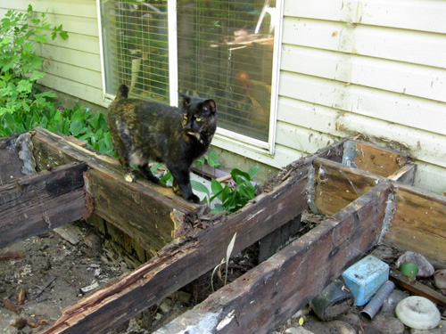 The planks are all removed. Later this evening we’ll tackle removing the rest. All of it is going in a big pile on my driveway. We’re going to have to borrow a truck to take it to the dump, but I think that’s a job for another day. For now I leave you with a picture of our cat who is confused by this project.