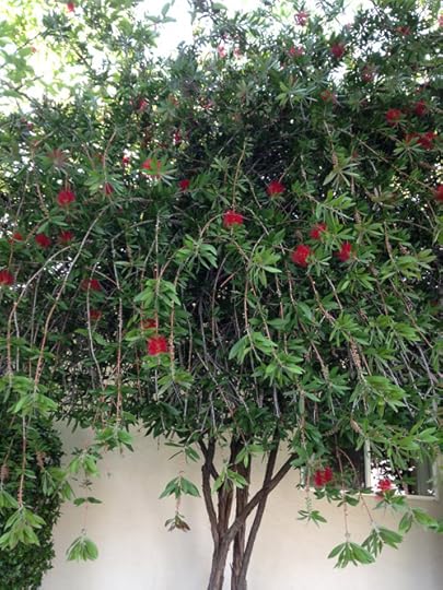 So for me a palm tree is a bird sanctuary. I love them for that, though they are, sadly, not easy to climb. Some time in the past fifteen years squirrels moved into the neighborhood and took over the palm tree. This did not please my neighbor, who put a metal sheath around the trunk to keep them out. So now the squirrels nest everywhere else instead. Once chased out, the pigeons have not come back. The palm tree is quiet now.
