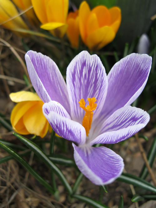 The crocus always comes first. I love crocus because it is the promise of spring to come. Hyacinths are next.