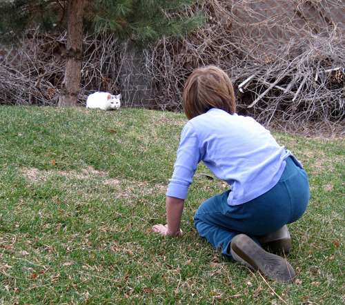 They fill the air with fragrance. Soon I will have daffodils. Then tulips. Then lilacs. I love spring. I love that the kids can finally get outdoors. To celebrate the outdoors weather, here is a picture of a young girl and a young cat stalking each other.
