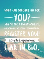 Register now for your free, one-on-one, no strings, twenty-minute conversation about how coaching can help you shift your life/work/relationships/career/self-care into greater alignment. CLICK HERE to register now.