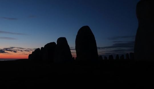 Efter att ha anlänt till Kåseberga gårdshotell igår tog vi en promenad upp till Ales stenar. För ovanlighetens skull var det alldeles vindstilla och det låg en förväntan i fuktmättad luft. Över oss seglade svalorna och och det var som att de förflyttade oss till en annan tid. För mitt inre såg jag hur folket vandrat hit i tusentals år inför vårdagjämningen. Och plötsligt gick det upp för mig att det inte handlar om skeppssättningen. Nej, det handlar om platsen. En plats som varit helig i tusentals år, men utformats på olika sätt utifrån den rådande kulturen. Kanske användes stenarna ursprungligen i en stendös. Kanske fick stendösen så småningom skålgropar när offrandet kom på modet. Liksom vi idag vill begrava våra döda på heliga platser (läs så nära kyrkan som möjligt) önskade våra förfäder begrava sina döda på de heliga platserna.