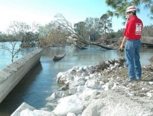 U.S. Army Corps of Engineers’ Anthony Bertucci calls in the status of the floodwall at London Avenue Canal’s upper breach near Robert E. Lee Boulevard.