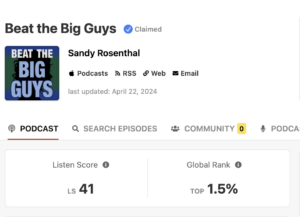 Founder Sandy Rosenthal’s podcast––called Beat the Big Guys––has a global rank in the top 1.5% according to Listen Notes.