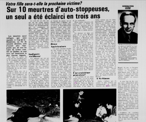 But Le Petit Journal wasn’t done. In December 1972 they published an expose, “NOS POLICIERS INCOMPETENTS? – DES MEURTRES ODIEUX QUI NE SERONT JAMAIS RESOLUS” (Cliquez ici pour l’article original en français). Penned by Gerard Asselin, the piece is so good – and pretty much lost to history – that I am going to print the whole thing: