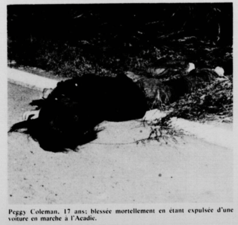 Deux AméricainesUn autre attentat double fit une vicime et une blessée très grave il y a plus d’un an. Deux jeunes Américaines de la Californie visitant le Québec sur le pouce. Peggy Coleman, 17 ans, et Anne Jones, 18 ans, montaient bord d’une voiture à Saint Hubert. Un peu plus tard elles étaient éjectées de cette voiture en marche pres de l’Acadie. La jeune Coleman était tuee sur le coup et sa compagne grièvement blessée. Cette dernière avait perdu tout souvenir de l’aventure et fut longuement hospitalisée. Elle était de retour à Montreal récemment pour tenter d’identifier ses assaillants dans les filières de la police locale ou de la SQ. On n’a pas encore donné les résultats de ces recherches.