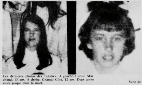 La répugnante execution de Chantal Côté et de Carole Marchand. à Cap de la Madeleine rappelle étrangement un double meurtre survenu à Québec il y a deux ans. Aline Travers et Suzanne Mercier, deux jeunes Beauceronnes de 18 ans vivant à Quebec, étaient vues pour la dernière fois en faisant du pouce sur la Grande Allée à Québec. On retrouvait leurs corps dans un boisé de Saint Romuald quelques jours plus tard. Elles avaient été sexuellement assaillies mais portaient leurs vêtements lors de la macabre découverte. Elles avaient été exécutées toutes deux d’une balle dans la tete comme les martyres du Cap. Ces meurtres sont ils reliés?