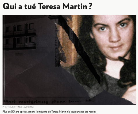 In September 1969, in Montreal-North, the terribly mutilated body of 14-year-old Teresa Martin was found on the side of a small road. The murderer is still on the loose.