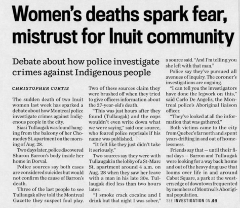 David Chapman, “Women’s deaths spark fear, mistrust for Inuit community”, Christopher Curtis, The Gazette, September 8, 2017
