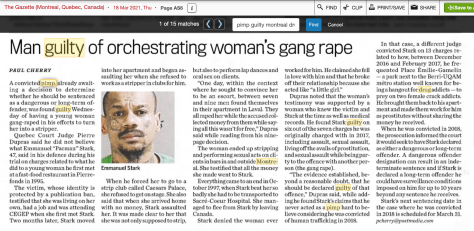 It’s hard to know exactly what happened to women like Donna Paré. People are fearful, unwilling to talk. They don’t want to disappear. We have some knowledge of victims like Siasi and Nunia, we know even less about the men who abuse them. For some perspective, consider the case of 49-year-old Emmanuel “Pacman” Stark, a Montreal pimp found guilty in March 2021 of orchestrating the gang-rape of a young woman.