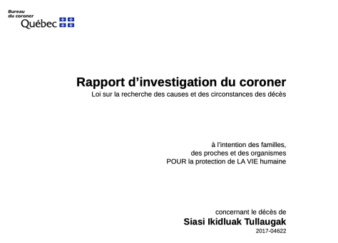 Siasi Tullaugak’s coroner report is interesting when viewed in the context of the above conclusions. At 5:53 a.m., August 29, 2017, a SPVM patrol car was intercepted by a passer-by who told officers there was a body hanging from a building. Police then found Tullaugak hanging from the balcony of the Chomedey street apartment building. She was identified by her ID papers which were found in her clothing. Police were unable to resuscitate her, and Tullaugak was pronounced dead at 6:50 a.m. at the Montreal General Hospital. Hanging was determined as the cause of death, but the instrument used to hang her wasn’t identified. Toxicological analysis was performed, but the results were not disclosed. The coroner determined that “Siasi Ikidluak Tullaugak died of suffocation by hanging”, then concluded “This is a violent death.” The report goes on to say that it is not the role of the coroner to pronounce the civil or criminal person responsible in such matters, and, as this is “still an open file at the SPVM”, the analysis of the event remains open.