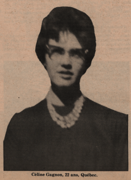 Celine Gagnon, age 22, December 28, 1966 in Quebec City : In 1972 a young man from Sept-Iles walked into a police station and declared himself the murderer of Celine Gagnon. Because he was a juvenile offender at the time of the murder, a judge sentenced him to 23 months in prison. The Gagnon family took a civil action to court demanding reimbursements totaling $21,072.14 to cover funeral expenses for their daughter, but were denied restitution.