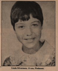 15-year old Linda Silverman was found murdered January 4, 1970 in the Piedmont / Laurentian region north of Montreal. Silverman was from an affluent family – her father was the psychiatrist, Doctor Marvin Silverman – and lived in Ottawa. She was found dead in a snowbank. The body showed no sign of violence, no rape, except she had been strangled from the cord on her ski jacket. Linda had been with a friend, Kareen Eidinger spending the weekend skiing near Sainte-Agathe and Saint-Sauveur, just north of Saint Jerome.