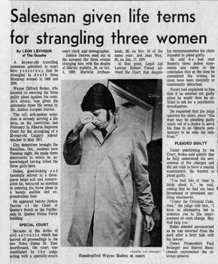 When Wayne Boden was finally arrested in 1971, Quebec police immediately took credit for Calgary’s efforts. Montreal police homicide cop, Guy Gaudreau stated the strangulation murders were, “one of the toughest cases we’ve ever had to solve.” The lack of humility and perspective is ear-ringing. Boden was only collared for the Montreal murders when an observant Calgary journalist tipped Montreal police that the murder of Elizabeth Anne Porteous looked a lot like Montreal’s “vampire killer”. Montreal police spent hundreds of hours searching for the man named “Bill” who they believed was their killer. They even produced a mysterious photo of their alleged suspect who ultimately turned out to be one of the victim’s fathers. Once in custody, Boden immediately and freely admitted to the murders of the three Montreal women. Montreal police’s ‘toughest case to solve’ was essentially handed to them on a silver platter.