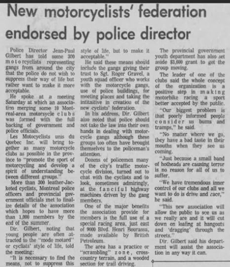 Surrounded by Loubier, Dalzell, Police Director Jean-Paul Gilbert and other Quebec officials, a scruffy looking Anthony “Tony” Gervais proceeded to give an account of how the bikers had spent $3,600 of the public’s money ( we have no record of this inventory). In his next breath Gervais asked for an expansion of the MUQ program, now requesting $15,400 for, “a winter sports program, the upkeep of the land that Ville d’Anjou and British Petroleum Canada Limited had loaned them, and the establishment of a monthly journal.” Clearly the bikers had learned very early that the key to success was to go legit. One wonders what went through the heads of the stoney-faced gentlemen in suites and ties as they sat through this spectacle. Did any of them sense the dangerous precedent, the uncomfortable alliance that was being established between the police, biker, and the Quebec government? What terrible blemish was slouching towards Ville d’Anjou?