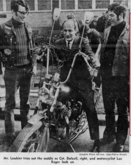 The inaugural event of the newly formed partnership between police and Quebec bikers was a motorcycle rally. On May 24th, 1969 police prepared for 300 MUQ members for a Saturday morning, 80-mile bike run. When 30 cyclists showed up, policed blamed the funeral of a slain biker that was held on the same morning. No doubt this was the murder of Pierre Boucher, a Popeyes MC member stabbed 58 times in a north-end park by three rivals in the Devil’s Disciples. What should have been an ominous red flag was blithely ignored by government officials who carried on with their tin pan parade. The poor turnout didn’t stop Provincial Minister of Tourism, Fish and Game Gabriel Loubier from posing with some bikers on the seat of a jacked-up Norton gushing, “I used to ride a bike myself.”