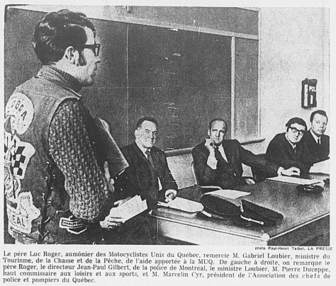 In April 1969 Montreal Police launched La MUQ or Association of United Motorcyclists of Quebec / La Fédération des Motocyclistes unis du Québec “formed with the full backing of government and police officials.” La MUQ’s figurehead was constable John Dalzell, a youthful cop who worked with bikers in one of Quebec’s earliest community policing programs. La MUQ was formed as a means of controlling the all-out war that had broken out between rival motorcycle gangs. Within six months, 10 clubs comprising 700 riders, the majority from the Montreal area, were brought under the umbrella of La MUQ to bring peace to the streets, or in Dalzell’s words to attain, “better club relations through sports.”