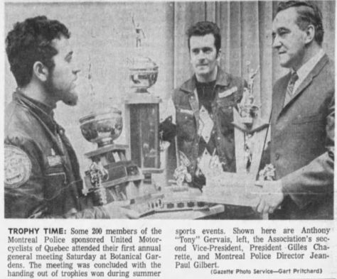 In November 1969, La MUQ held their first general meeting – oddly at Montreal’s Botanical Gardens – no doubt to ratify articles of incorporation and adopt the minutes of biker business (was there a quarum? Did they follow Robert’s Rules?). Again, Montreal Police Director Jean-Paul Gilbert was on hand, this time to hand out a vast array of trophies that would make the NHL awards feel inadequate.