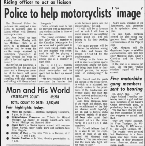 Unlike 1969, La MUQ is never mentioned in the press in 1970 or thereafter. There are no interviews with John Dazell. There are no photo ops with Quebec tourism ministers on motorbikes. When Dazell retired in the 1990s he talked about his exploits back in the day working with dangerous bikers, but he never mentioned his founding of La MUQ.
