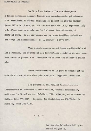 From this press release, which must be from 1970 – probably just after February 1970 when the Surete du Quebec took over the case – we can now see that the inscription carved on Teresa Martin read, or the SQ wanted the public to believe read, “F.L. FRENCHY I LOVE YOU”. The notice summarizes that Martin was a young student, that she was found dead on the 13th of September, 1969, near a tavern on Henri Bourassa Blvd. in Montreal North, and that any cooperation on the part of the public would be considered an act of civic duty aiding the justice system.