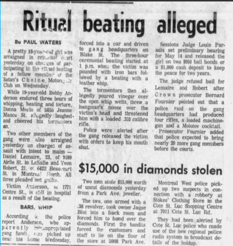 Cotty’s participation in all of this is unclear. At one moment we are told she was a gang member, then by her account she was forced into prostitution and the beating of the 15-year-old. There is an account from May 1970 where an 18-year-old girl, who is identified as a member of Satan’s Choice, participated in the “ritual beating” of another gang member. While 19-year-old Bobby Anderson endured three hours of “whipping, beating and torture”, the girl laughed and cheered on his two tormentors. One of these gang members is identified as 21-year-old Yvon Robert of 6422 rue Beaucourt in Montreal North. Curiously Yvon Robert’s residence was nestled right between boulevards Leger and Henri Bourassa; a 3 minute drive from the tavern where Teresa Martin was found, and a 4 minute drive from Teresa Martin’s home.