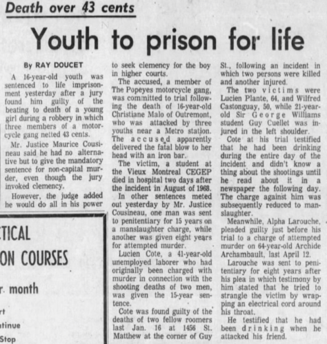 In August 1968, three Popeyes motorcycle gang members, crowbars in hand, stood outside the Kimberly and Ontario metro exit, waiting for a female victim – any female victim – to rob. The three struck 16-year-old CEGEB student, Christiane Malo repeatedly about the head. They ran off with Malo’s umbrella, her perfume and 43 cents from her purse. Christiane Malo died two days later in a Montreal hospital. On October 15th, 1969 – a month after Teresa Martin’s murder – 16-year-old Michel Perrault was sentenced to life in prison. The judge commented:
