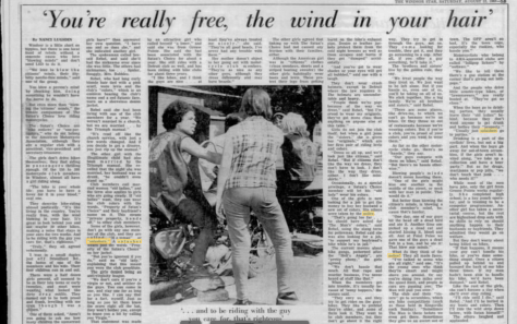 Finally, a social awareness piece from 1967 in the Windsor Star spells out what “splasher” meant in biker culture. In 1967 a woman writer named Nanci Lugsdin interviewed women and girls affiliated with the Windsor, Ontario chapter of the Satan’s Choice motorcycle club. This is a biker-wife named Rebel’s account of how women functioned in the biker world: