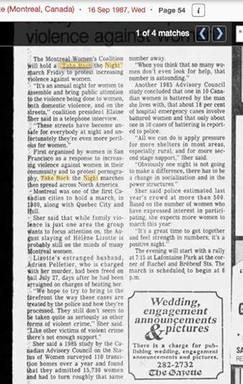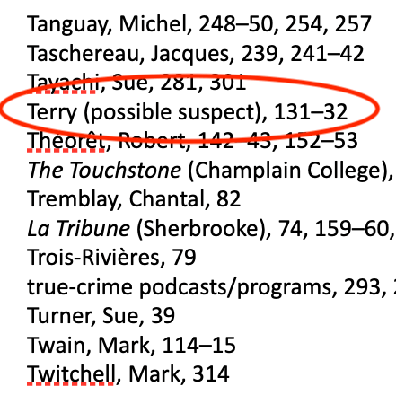 Story C was research. It would probably end up as two paragraphs in Story A, The Lid. It also has elements that reflect, foreshadow, comment… And I am in no hurry to tell this story. I have a lot of information on this case, but I haven’t quite figured out how to land the plane. I haven’t completely worked out the staging. It has all the elements that you’re accustomed to hearing on WTK – set in Quebec, unsolved murder, criminal investigative failures. Quebec lives in this echo chamber of delusion. If you think the fake-news era in the States is bad, Quebec has been living in a version of this landscape ever since Champlain planted a fleur-de-lis on The Mountain. What strikes me about this case is how the narrative has changed over the last 50 years. There is now a very controlled version of this story, and most of the elements that would help solve the case have been dropped. I don’t buy the versions of this story peddled by the police and the press.
