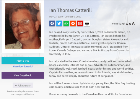 Still, there were always questions surrounding Caterill that never got answered. As his obituary documents, he ended up on Gabriola Island, B.C., North of Victoria and Vancouver Island. One of the reasons we mentioned Luc Gregoire’s 1985 arrest in Saanich, B.C. – also on Vancouver Island – was to open the door for the possibility that Gregoire and Caterill knew each other, maybe having met in the low -evel drug trade in the Sherbrooke area in the late ’70s.