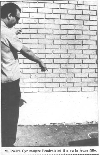 Photo Police gives us yet another version of the tattoo inscription reporting it was. “”I love you french” avec les initiales V.L.” that was inscribed, and stating that police are pondering whether this is the mark of a sadistic individual, or from a band of bikers. The article says the marking is “very recent” and “may have been made after her death.” They also publish a photo of M. Cyr standing next to the tavern wall.