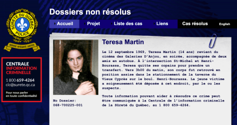 After the autopsy is performed and it is proven conclusively that there were no drugs or alcohol in Teresa Martin’s system does the Journal de Montreal clarify and apologize for their errors? No, they simply never report on the case again. If all of this sounds vaguely familiar, it is exactly what the JdM did in my sister Theresa’s case nearly a decade later. You can read all about that over at this post ( click the link).