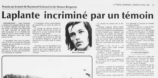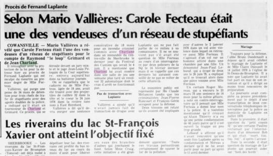 “The majority of yesterday’s testimony in the case of Fernand Laplante, charged with first degree murder in the death of Carole Fecteau at East Hereford on June 20, 1978, was devoted to the testimony and cross examination of a young male. The press notably only represented by The Record were forbidden to mention his name, address, age, occupation, as well as the Christian name of his brother. Justice Jean Louis Peloquin also imposed other restrictions concerning his testimony.”