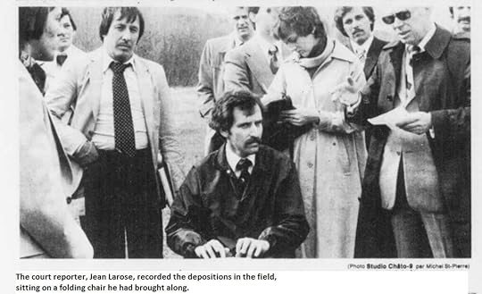 On April 23, 1979 the court took a field trip to the site where the bodies of Grimard and Bergeron were discovered. The photographs from La Tribune of this event are surreal, with the accused, Fernand Laplante strolling through country fields along side Jean Charland and the seven-man – five-woman jury, like some bellicose Renn festival. The jury had been bused out on on a charter supplied from the Department of Justice. Court reporter Jean Larose brought along a folding chair to add to the picnic atmosphere.