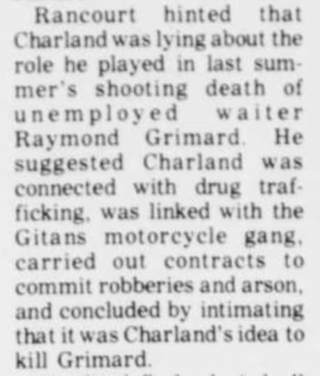 On Friday, April 27, 1979, defense attorney Jean-Pierre Rancourt called 20-year-old Luc Landry to the stand. Landry revealed that in a conversation at the Moulin Rouge in the summer of 1978, Jean Charland told him how “he riddled a guy behind the garbage cans on Wellington Street”, and that Raymond “the Wolf” Grimard was actually a “stooge” working for the police. At the time of his testimony, Landry was serving a two-and-a-half-year sentence for theft and his parole eligibility was fast approaching.