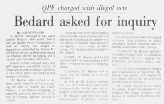Landry had originally been approached by agents Bolduc and Châteauneuf of the SQ who asked him if he wanted to testify against Laplante, bargaining that they could possibly get him out early. When Landry told them his story, they changed their minds and told Landry to “stay out of it”, now insinuating that they could make things go wrong for his parole. Landry related how Bolduc and Châteauneuf punctuated their words “with kicks and punches”. We now can see that this was not the behavior of a few ‘bad apples’ but an institutionalized approach used by Quebec’s provincial police force. Beatings were administered not only to players in the criminal underworld like Landry, Laplante, and Claire Dussault-Laplante, but also regular civilians like the hotelier, Paul Bergeron.
