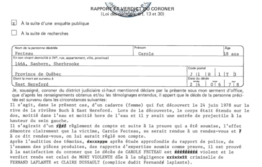 Note that when Coroner Jean-Pierre Rivard issued his verdict on October 16, 1978 holding Fernand Laplante criminally responsible for the violent death of Carole Fecteau, he named Claire Dussault equally complicit in the murder: