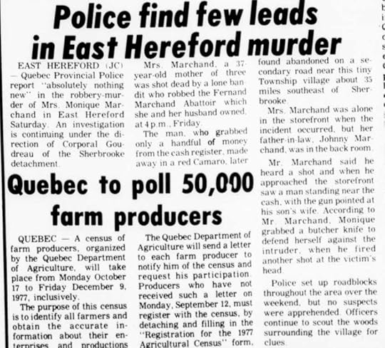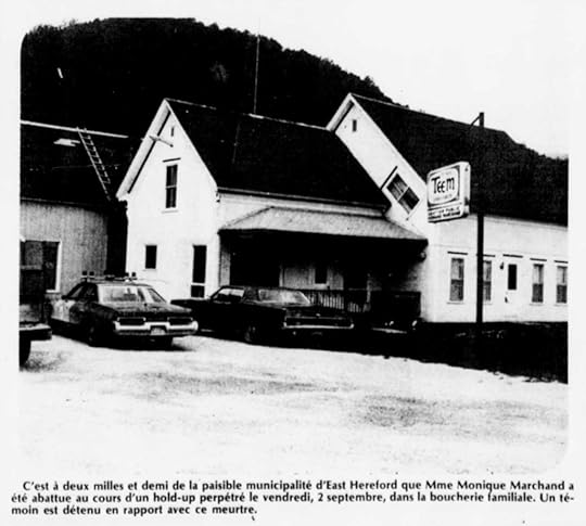 The East Hereford Double EventOn Friday afternoon, September 2, 1977, the start of Labor Day weekend, someone shot 37-year-old Monique Marchand, a butcher store clerk and mother of three, while she was working the counter of her store in East Hereford. The lone bandit robbed the Fernand Marchand Abattoir, grabbing only a handful of cash from the till, and got away in a waiting red and black Camaro with American license plates, later found abandoned on a secondary road. The market was located 2 1/2 miles south of East Hereford, along the road to the Beecher Falls, Vermont border crossing. Madame Marchand was alone in the storefront when the incident occurred, but her father in-law, Johnny Marchand, was in the back room. He said he heard a shot and when he approached the front, saw a man standing near the cash, with the gun pointed at his daughter-in-law. Madame Marchand was about to launch a meat clever at the man, at which point he shot her in the head.