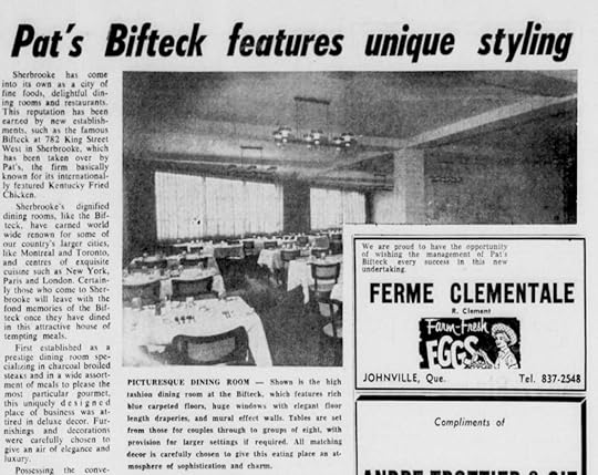 In November, 1963 they opened what will become their flagship chicken operation, Pat’s KFC at 849 King Street West in downtown Sherbrooke. They opened a third chicken shack in Granby, and finally in 1965, they acquired a fine dining establishment across the street from Pat’s KFC, The Bifteck. The boys took out a half-page of advertisements in the local papers. We are told that the new company was registering “fascinating gains”. The boys had big dreams: