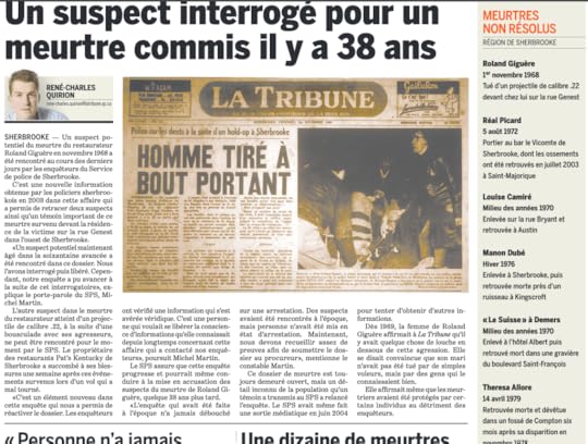 Note the number of qualifications here: ‘The investigation is never closed, but we are never really doing anything to resolve it.’ So what were the new elements? Police disclosed for the first time that Giguere was hit with .22 caliber bullets. A .22 is a cheap weapon usually used by low-end criminals. Police even questioned, then released two people considered to be important witnesses in the matter. Two years later, in February, 2006 La Tribune reported that investigators met with a “potential suspect” in the case. In fact, police by then had two suspects,