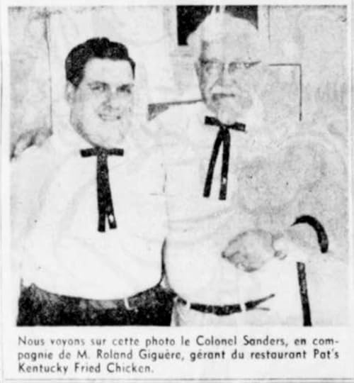 It’s the story of three guys who tried to build a chicken empire like St-Hubert BBQ in the Townships but wound up grounded. (For a great read on St. Hubert see “Ring-Ring-Ring” – The Murder of Michelle Perron) It started in the ’50s when Lennoxville native, Douglas Patrick opened a canteen on Speid street near The Georgian Hotel. Business was good, in April 1963, Patrick expanded and moved the canteen to Queen street, called it Pat’s Kentucky Fried Chicken / Pat’s BBQ, and became one of Colonel Sanders’ first franchises in the province of Quebec. Business continued to be good, so Patrick took on partners; Yvon “Charlie ” Charland became vice-president, and Rolland Giguere, was now director of the firm. I know, it’s already too many names, but it’s easy, I’ll help you. Charland is the french guy, he looked like Sinatra in his toothpick-thin era, the other two looked like those chunky session musicians who backed up Elvis – Chicken Pat, Chicken Charles and Chicken Rollie.