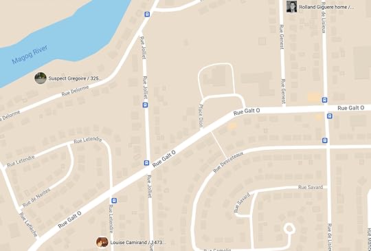 Finally, there is Luc Gregoire’s childhood home on rue Delorme in southwest Sherbrooke. We already discussed how Louise Camirand also grew up in this neighborhood, a few blocks from Luc Gregoire. What I did not know is the the 1968 murder of Rolland Giguere occurred in the same neighborhood, at his home on 1060 Rue Genest: