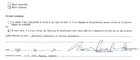 Quand on regarde les verdicts officiels du coroner Jean-Pierre Rivard pour les trois meurtres en date du 16 octobre 1978, ce qui frappe, c’est l’uniformité des trois documents. Ils auraient presque pu être réalisés avec du papier carbone en triple exemplaire. Trois meurtres distincts à deux endroits différents à deux moments différents. Deux victimes abattues, une matraquée et étranglée à mort; pourtant une seule partie responsable.