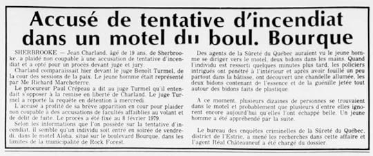 Le 10 novembre 1978, quelqu’un a tenté de mettre le feu au motel Aloha à Rock Forest. Vous vous souviendrez de Rock Forest comme dortoir à l’ouest de Sherbrooke (cinq ans plus tard, il deviendrait le décor d’un autre drame de motel : le massacre de deux poseurs de tapis par la police au Motel Chatillion). La tragédie a été évitée, la Sûreté du Québec se trouvait juste de l’autre côté de la rue avant que l’incendie ne soit allumé. La police a immédiatement interpellé un suspect de dix-neuf ans quittant les lieux de la tentative d’incendie criminel : Jean Charland. Bienvenue dans le monde du subterfuge Sherbrookois, où même la police joue un rôle dans le drame sournois.