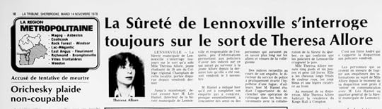 Ce que l’on sait de ces événements sortira éventuellement du procès de Fernand Laplante, prévu pour janvier 1979, mais reporté par la suite à ce printemps. J’avance ici parce qu’il est important de savoir que ces événements se sont déroulés le week-end du 10 novembre 1978, à l’époque où Theresa Allore a disparu, et son histoire a été rapportée pour la première fois dans les journaux locaux.