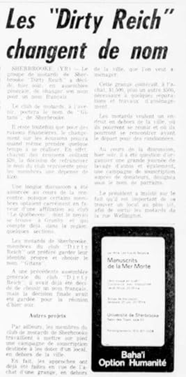 In 1969 The Dirty Reich motorcycle club of Sherbrooke officially changed their name to The Gitans at a general assembly meeting held that spring. The event was covered in the June 19, 1969 edition of La Tribune as if reporting on a matter of governmental business in Quebec parliament. It would take some time, La Tribune dutifully noted, for members to produce new crests which would cost the club $500 – could their treasury bear the expense! There was a long discussion of simply patching over and joining Le Quebecois MC in neighboring Granby, this would solve the problem, as it was argued of “Dirty Reich” not being French enough -though the name certainly had an old-world European feel to it. In the end a majority vote won the day, and The Gitans were born.