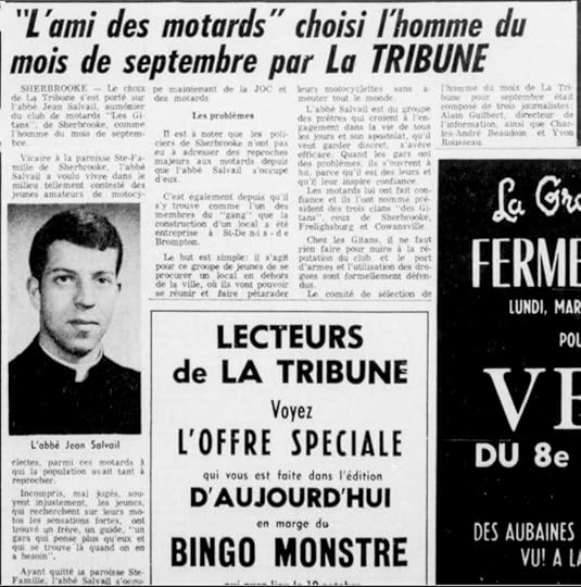 “L’ami des motards” choisi l’homme do mois de septembre par La TRIBUNEIn October 1969 La Tribune anointed Father Jean Salvail their ‘man of the month’, the young Abbé who “wanted to live in the contested milieu of young amateur motorcyclists whom the population had so much to reproach.” La Tribune continued: