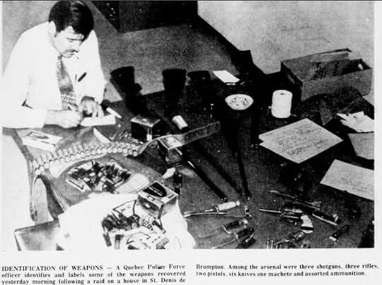 Three years later the calliope crashed to the ground. On October 5, 1973 The Sherbrooke Record reported how rivalries between the Atomes and Gitans, “broke into open war”. Georges Beaulieu and Lucien Cyr, who was said to be affiliated with a Montreal gang, were charged with shooting and the attempted beating of three Atoms’ members outside the Chez Freud discotheque. Members of the Sherbrooke Police and the Surete du Quebec (then named the Quebec Police Force or QPF) then raided the St Denis de Brompton ‘camp’ and discovered a large arsenal of “rifles, shotguns, revolvers, knives, a machete and weapons made from chains“, along side a large cache of ammunition.